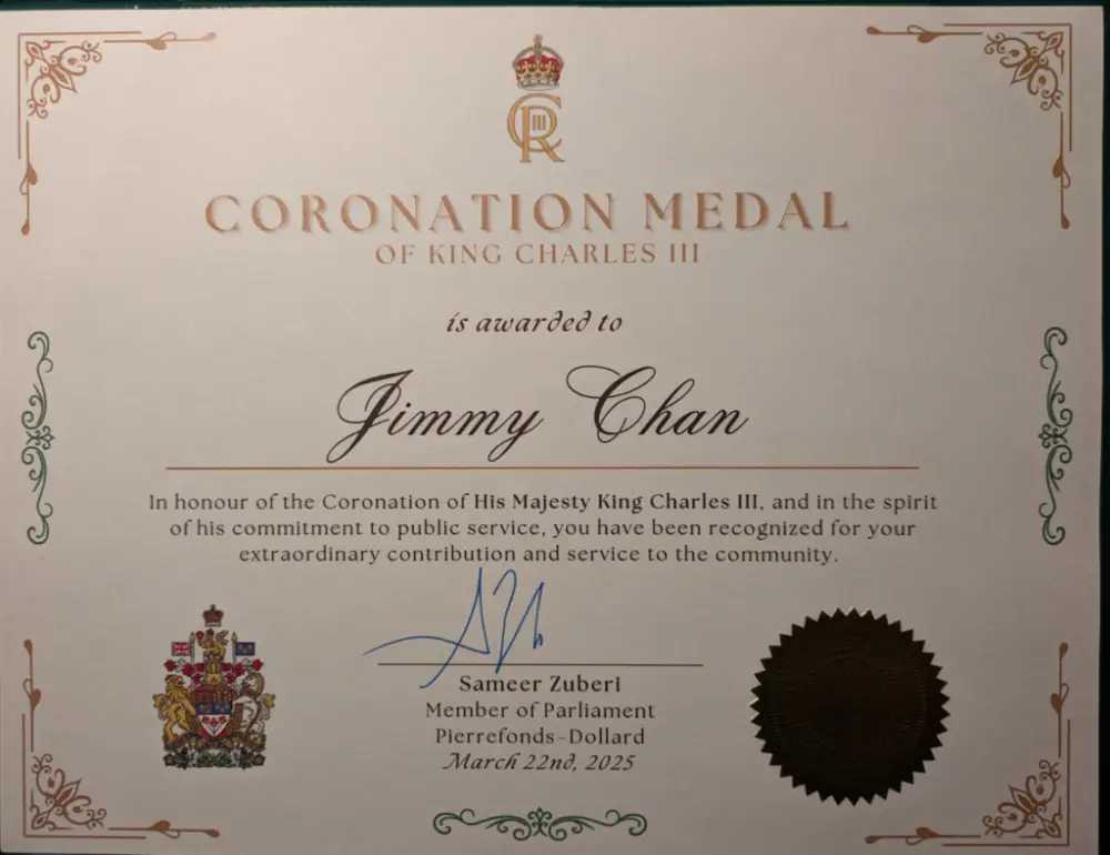 Montreal’s Jimmy Chan, is one of over 30 recipients this year to receive the most prestigious King Charles III Coronation medal this afternoon, Saturday, March 22nd in the Pierrefonds-Dollard borough, presented by Pierrefonds-Dollard’s MP, Sameer Zuberi.