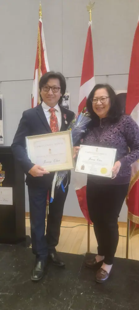 JImmy Chan stands with MNA Brigitte Garceau at the King Charles III commemoration ceremony.