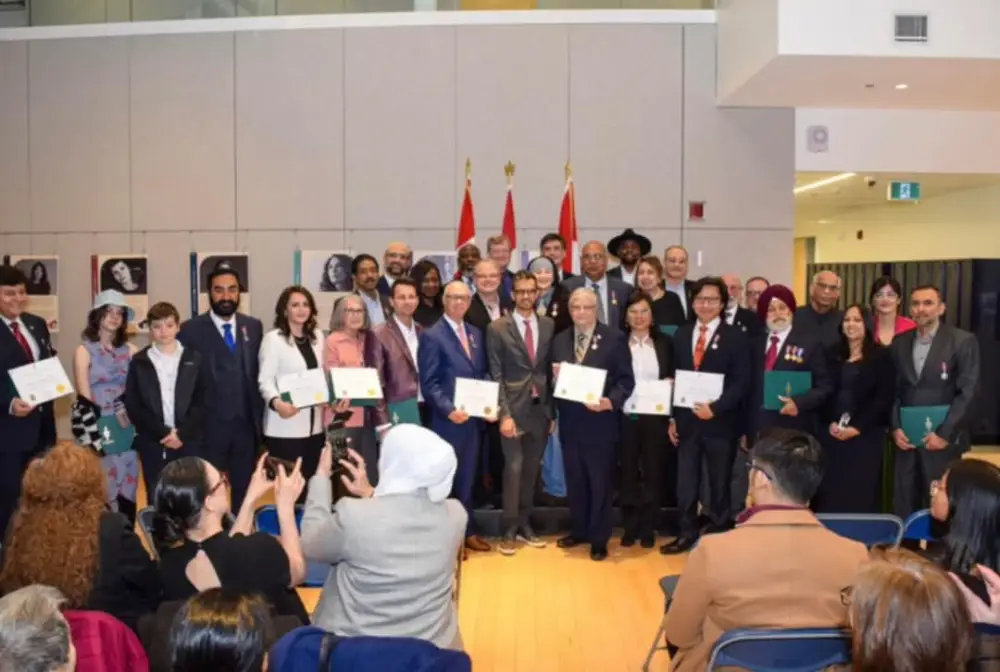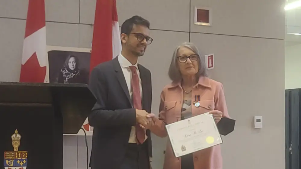 Luisa Miniaci-Di Leo poses with the Honourable Sameer Zuberi after receiving her King Charles III Commemoration medal and certificate on March 22, 2025.