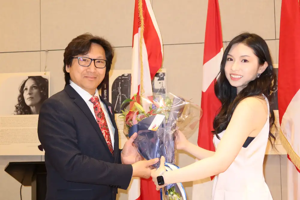 Miss Chinese Montreal, Queen Louese Hu, presents Jimmy Chan with a bouquet of flowers for receiving the King Charles III Commemoration Medal (2025). Picture courtesy of Linda Hu.